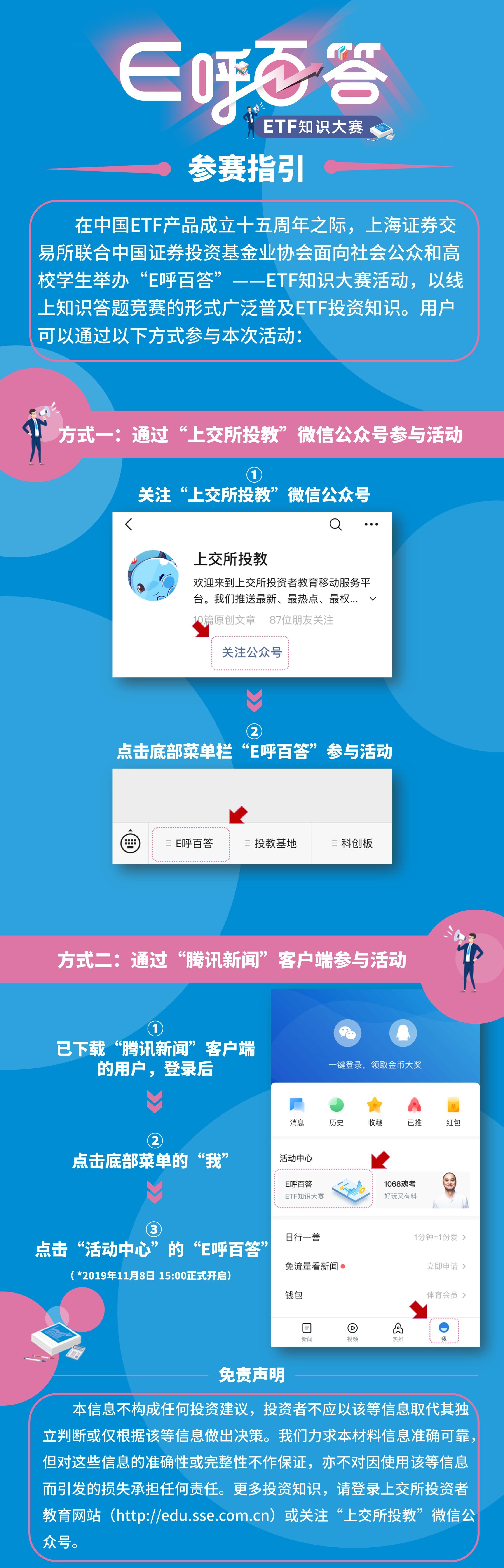 ETF(Exchange Traded Fund)是交易型开放式指数基金。ETF通过构建跟踪某一指数表现变化的组合证券,使投资者在买卖了一种产品后即可实现一揽子证券的交易,降低了投资者跟踪相关指数的交易成本。近年来,ETF产品受到市场投资者广泛关注,成为丰富其投资选择和财富管理的重要方式。在中国ETF产品成立十五周年之际,中国证券投资基金业协会联合上海证券交易所举办首届“E呼百答”——ETF知识大赛。大赛于2019年11月8日正式启动,历时3周,以投资者喜闻乐见的竞赛答题形式普及ETF投资知识和投资风险,引导投资者树立理性投资、价值投资意识。