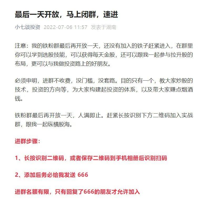今年7月6日,记者发现,微信公众号“小七谈投资”发布了一则邀请粉丝入群的通知。该通知申明,“进群不收费,没门槛,没套路。目的只有一个,教大家炒股的技术,投资的方向等,为大家构建起投资的体系,以及带大家赚点烟酒钱。”(目前该条微信因内容违规已无法查看)