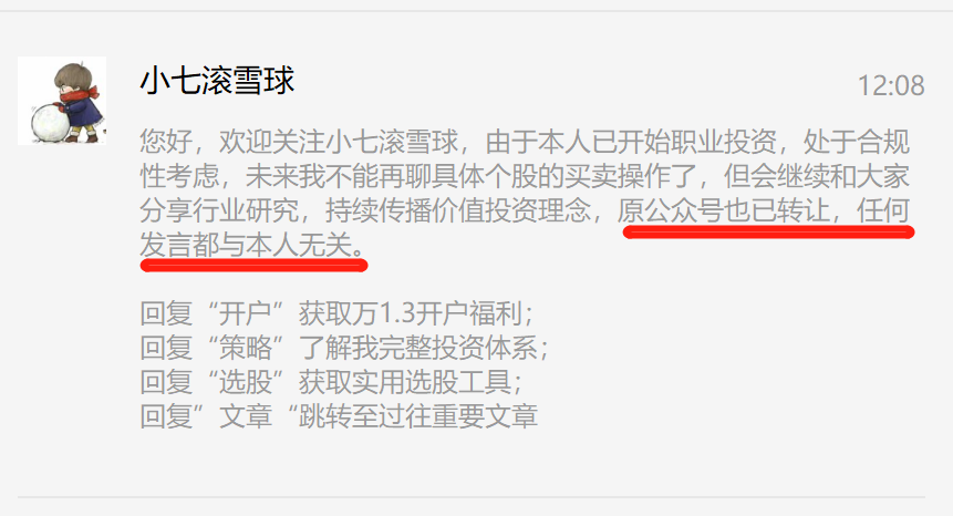 根据“小七谈投资”《关于粉丝迁移至本公众号的说明》显示,粉丝之前关注的公众号”小七滚雪球“已经将全部业务、功能转移至本公众号。