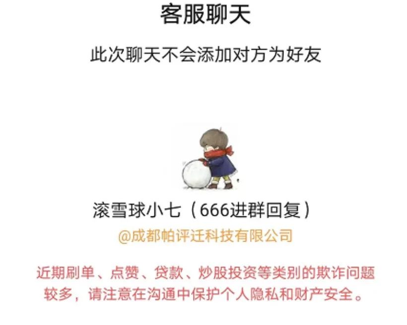 “小七谈投资”公开邀约加入的群,在入群之前,需要先与公众号客服取得联系,该客服取名叫“滚雪球小七”,与“小七滚雪球”名称高度相仿。