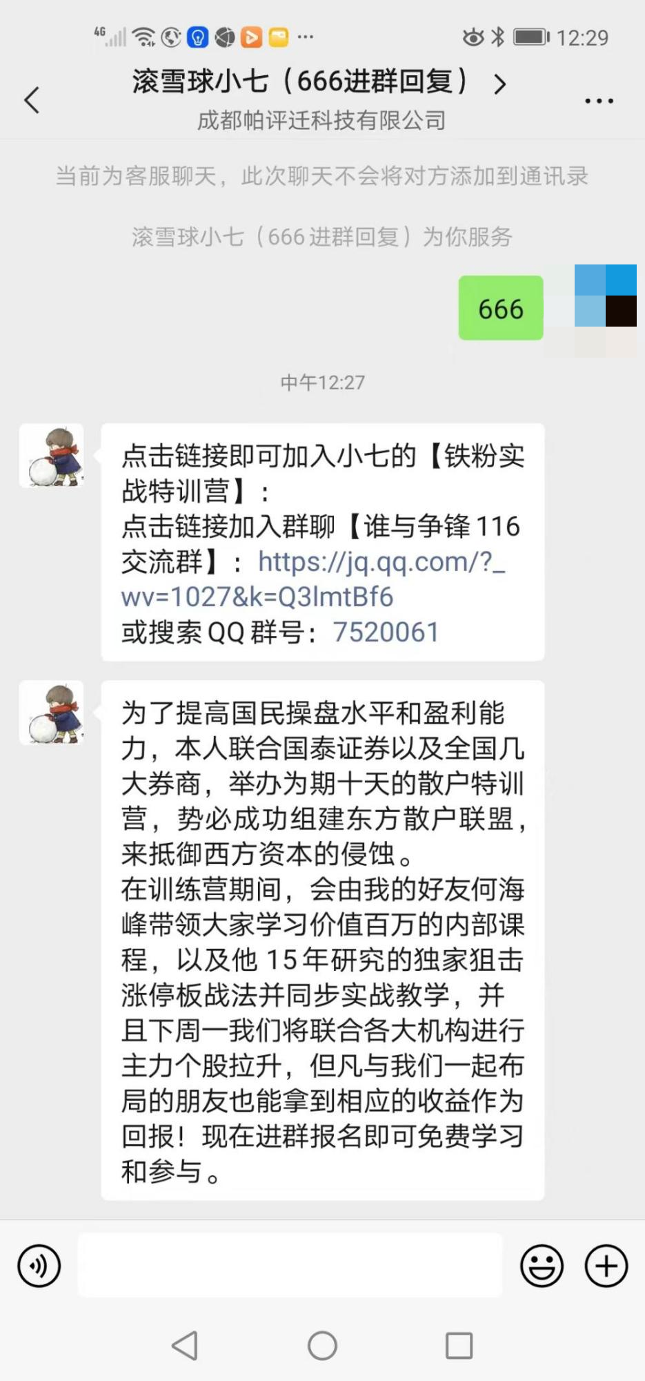 “小七谈投资”公众号客服向记者发送的一条提示信息称,“为了提高国民操盘水平和盈利能力,本人联合国泰证券以及全国几大券商,举办为期十天的散户特训营,