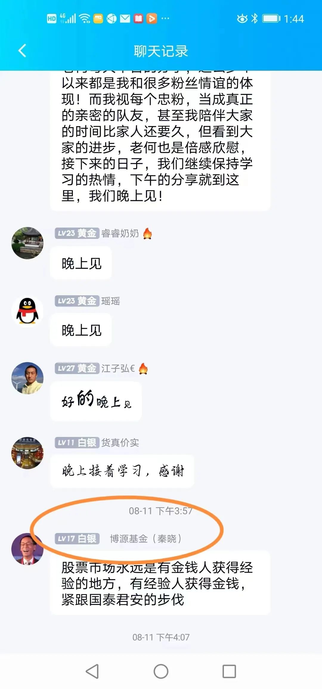另外还有署名“博源基金秦晓”的私募曾在群内宣称,“股票市场永远是有金钱人获得经验的地方,有经验人获得金钱,紧跟某某证券的步伐”。