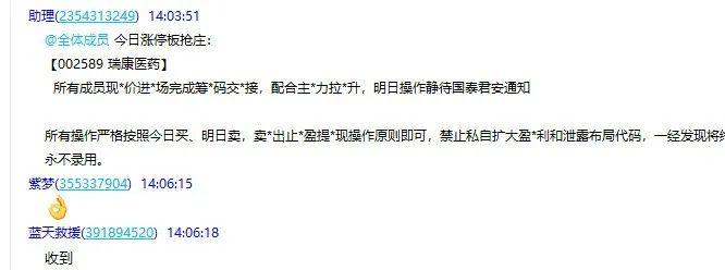 当天下午,群助理在群中发布了所谓的“涨停板抢庄”的通知,号召群成员限价买入瑞康医药。