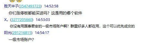 对于总是能成功买入涨停板个股的操作,有投资者在群中提出了质疑,“你们涨停板都能买进吗?这是用的哪个软件。”