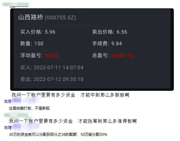 相比之下,在上述两项“权限”中,“打新”的“盈利”要更为丰厚,所谓 “中签是肉,涨停板是汤”。对于“打新”的玩法,该助理表示,账户资金越多,打新的次数也越多,
