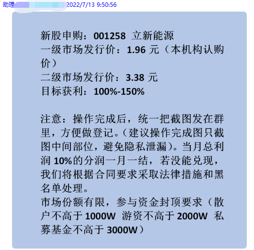 记者注意到, 近期,在群内发布的相关新股申购操作通知中,该团伙都声称自己拿到的新股认购价要大幅低于发行价。值得一提的是,