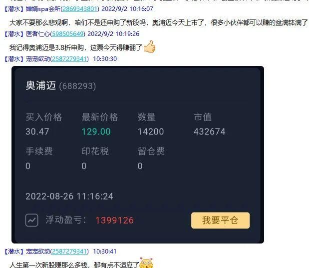 今年9月2日奥浦迈上市后,一些“中签”的投资者纷纷在群内晒出了“浮盈”情况,例如,有投资者在8月下旬曾经以30.47元的价格“中签”了奥浦迈1.42万股新股,而该公司实际发行价格为80.2元。