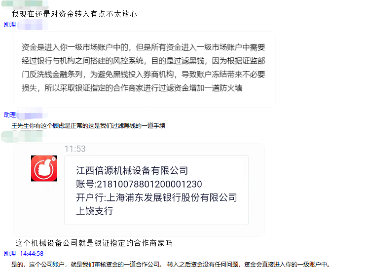 对此,每经记者向群助理提出了疑虑,群助理表示,所谓的江西倍源机械设备公司就是银证指定的合作商家,“这个公司账户,就是我们审核资金的一道合作公司。转入之后资金没有任何问题,资金会直接进入你的一级账户中。”