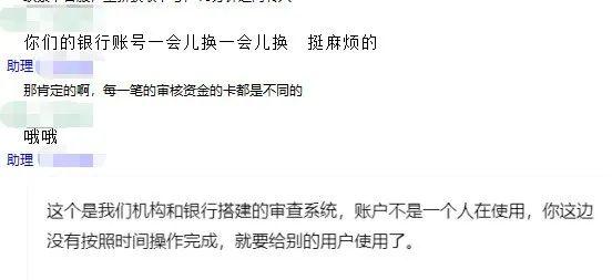 对此,助理给出的解释为,“因为每一笔审核资金的卡都是不同的。这个是我们机构和银行搭建的审查系统,账户不是一个人在使用,你这边没有按照时间操作完成,就要给别的用户使用了。”