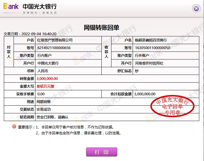 除了上述异常的收款账号外,该团伙还会虚构一些正规机构给他们打了款。例如,9月4日曾在群内出现一张网银转账回单截图,付款人的户名为“红塔资产管理有限公司”。据启信宝显示,红塔资产管理有限公司是红塔证券的控股孙公司。