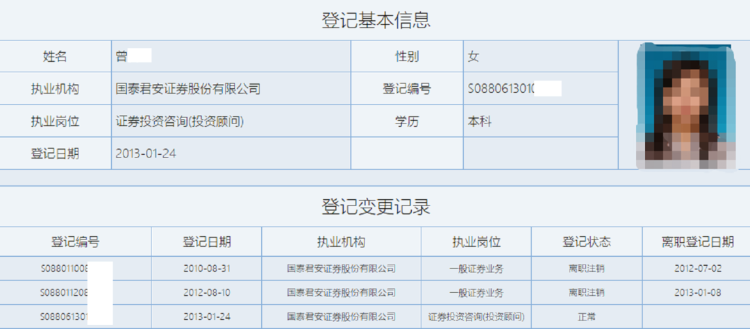 例如,最近,群里发布的一则通知称:某助理,涉嫌利用职务之便,借助他人账户参与一级市场,谋(牟)取暴利,现已被证监会吊销执照。而新上任的助理“曾Jin”的证券执业编号为“S0880613010XXX”。