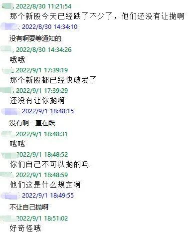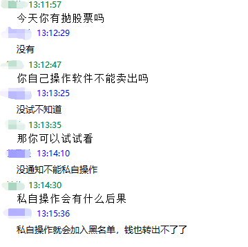 在9月2日天力锂能跌破发行价当天,该群友仍然未被允许抛出股票,“没通知,不能私自操作。私自操作就会加入黑名单,钱也转出不了。”