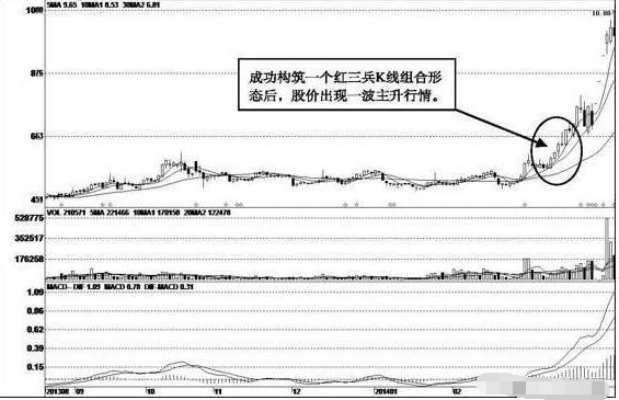 实例图,宜华地产:这是成功构筑红三兵K线组合形态后出现主升浪走势的例子。该股在长时间的底部盘整过程中,庄家吸纳了大量的低价筹码,2014年3月17日成功构筑一个红三兵K线组合形态,且该形态突破了底部盘整区域,此后股价形成一波主升浪行情。