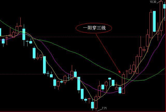 股 价经过长期下跌以后,做空能量得到了有效释放,成交量的日益萎缩,表明场内浮动筹码已经不多,随着时间的推移,成交量由小到大,表明有一股资金正在悄悄吸纳,而股价波幅的日益收窄,表明庄家的收集已经进入尾声。如果有一天股价突然携量上攻,那一定是庄家大打出手了,快速跟进方显英雄本色。“一阳穿三线”是 股价起涨的临界点,从这个点位切入,一般都会获得一段可观的利润。