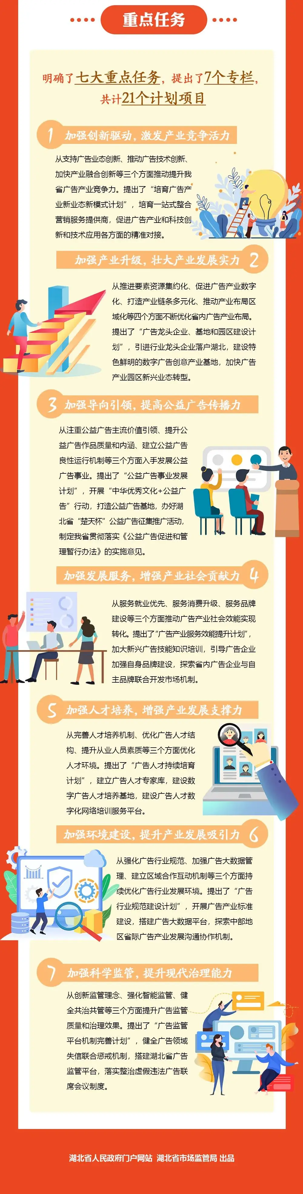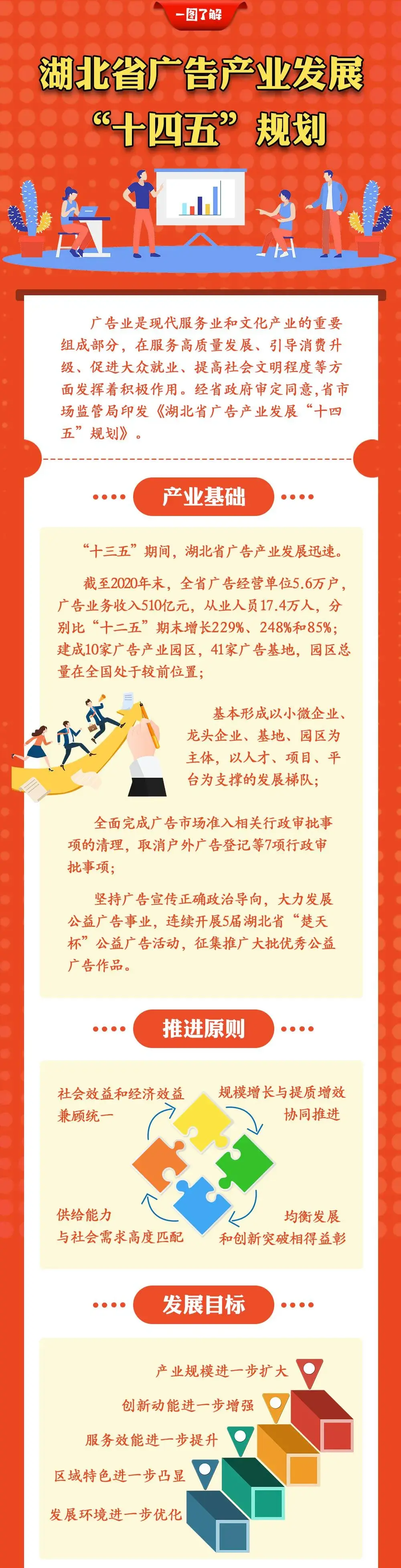 近日,经省政府同意,湖北省市场监管局印发《湖北省广告产业发展“十四五”规划》(以下简称《规划》),明确湖北省广告产业“十四五”时期发展的指导思想、推进原则、发展目标、重点任务和推进措施,描绘五年发展愿景。
