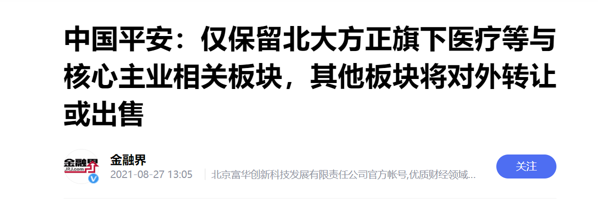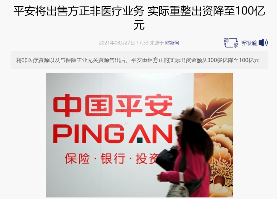 方正重整计划执行7个月后,在平安投资款拖拖拉拉、迟迟不到的同时,2021年8月27日,中国平安业绩发布会上,中国平安总经理兼联席会议首席执行官谢永林接受第一财经记者采访时突然改口:“平安参与北大方正集团司法重整,主要是看重医疗资源的协同。接下来只会保留医疗等与核心主业相关的板块,其他部分正在按照预定计划,按部就班地以市场化方式对外转让或出售”。