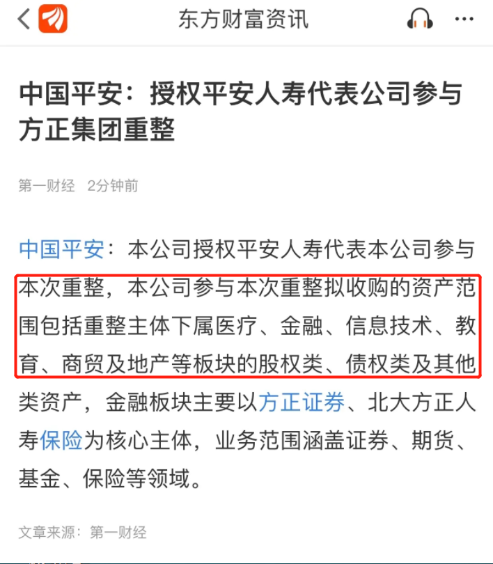 也就是说,表面上平安出资几百亿重整了方正,实际上通过破产、转让、倒卖资产等方式,平安会回收大部分出资,只用极小的代价甚至零成本就可以收获方正的医疗等核心板块。