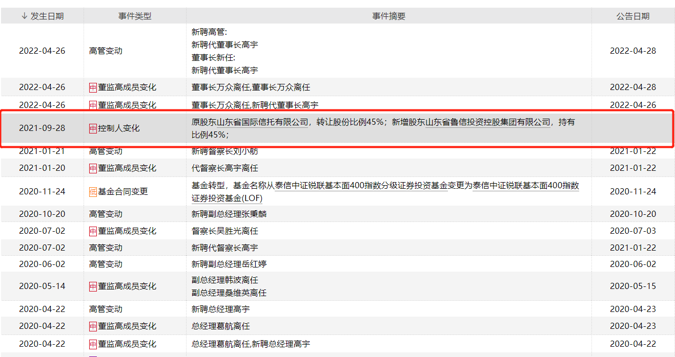 值得注意的是,2021年9月,泰信基金原股东山东省国际信托,转让了其持有的全部股份45%。