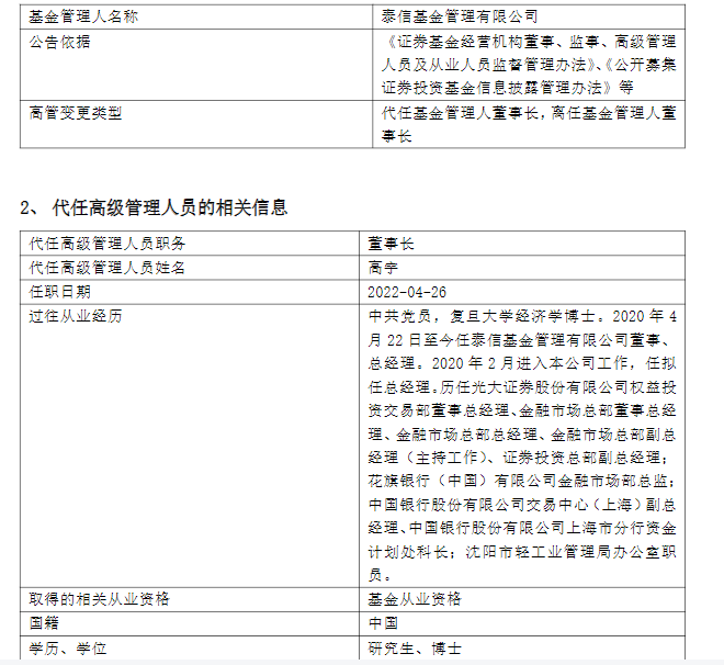 4月28日下午,泰信基金发布公告,公司董事长万众,因工作安排离任,总经理高宇暂代董事长一职。(见下图)