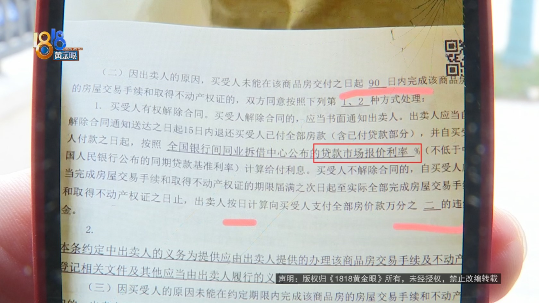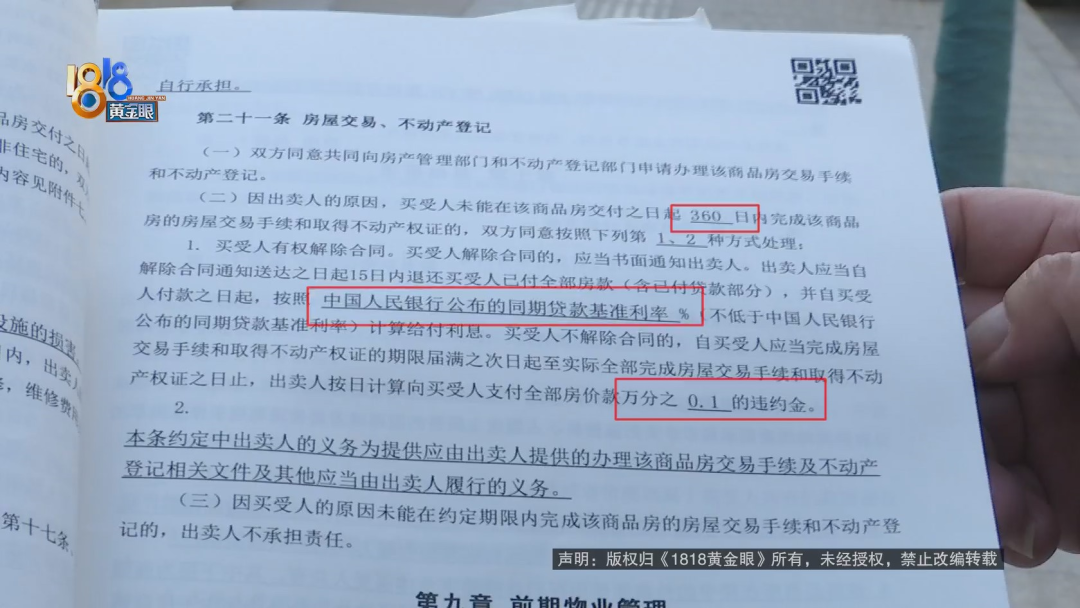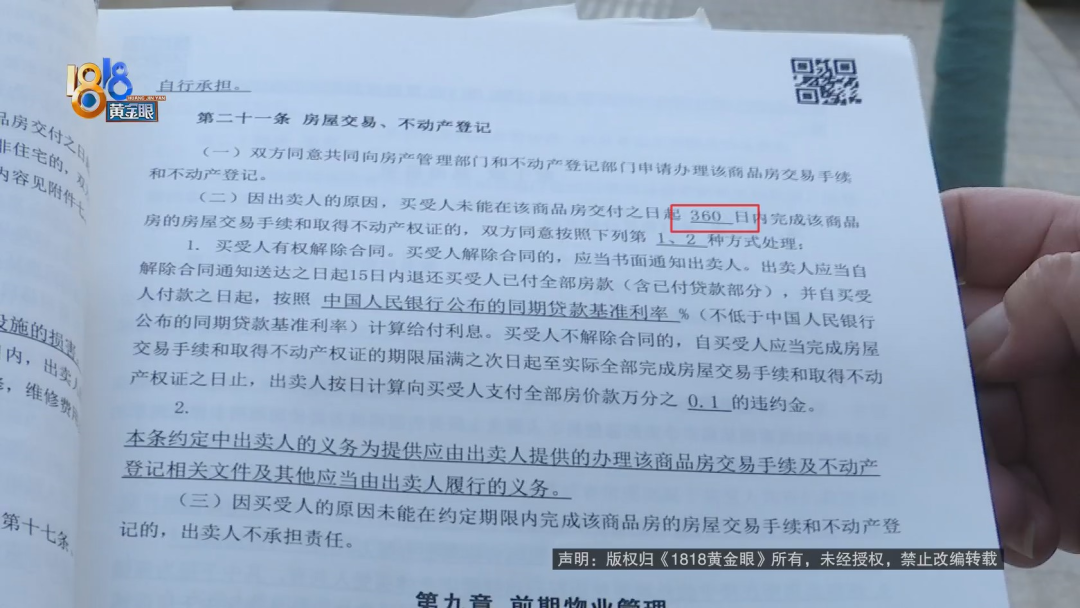 商品房买卖合同显示,周女士和丈夫购买了杭州钱塘区万固珺府8号楼的一套房子,合同的第二十一条是关于房屋交易和不动产登记,约定如果因开发商的原因,购房者没能在商品房交付之日起360天内,完成交易手续和取得不动产权证的,双方同意按下列第1、2种方式处理,第1种方式包括购房者解除合同的,开发商应当