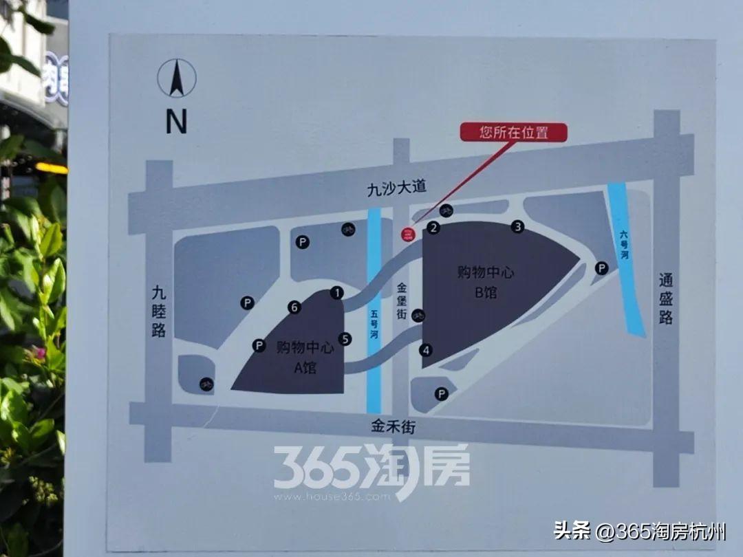 国芳天街位于九堡板块九沙大道与通盛路交汇处,分A馆、B馆两部分,中间被道路和河流隔开,由两道四层的空中连廊相连。