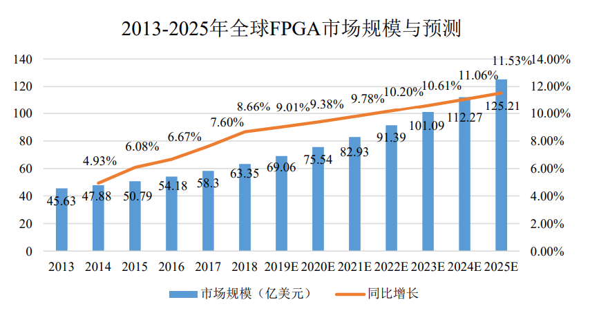 紫光集团前董事长赵伟国曾说过,相对于其他通用芯片,FPGA属于战略芯片,发展FPGA对国家战略意义重大。调研机构MarketResearch Future预测,随着5G和AI的发展,全球FPGA市场规模将从2018年的63.35亿美元增长到2025年的125.21亿美元。