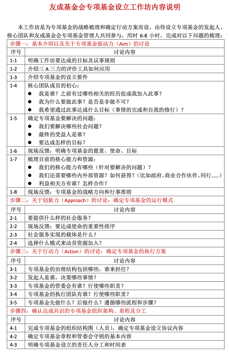 在友成,经常有一些潜在的捐款人有发起专项基金的请求,这些潜在捐款人除了具有通过公益来实现自己的心愿以外,对将要从事的公益活动的方向也有大概的意愿,但是对于真正做什么、如何做、如何评估项目的社会价值却一无所知。使用“三A三力”和这些捐款人一起通过工作坊的方式,就可以帮助专项基金的发起人,梳理出一个非常清晰的、既具有整体性又具有细节性的解决方案,即战略。