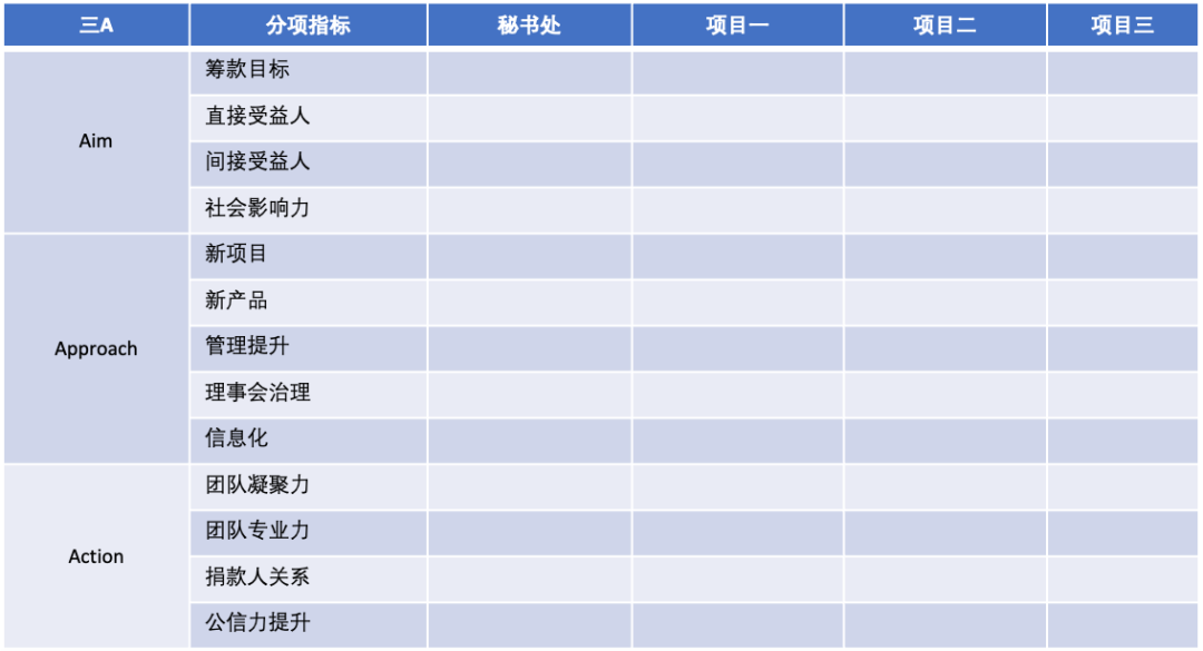 “三A三力”因其“目标-方法-行动”有机构成的框架和逻辑,天然可以成为绩效考核的工具。友成基金会每年的年终述职考核,用的就是这样一个框架,每个员工在述职结束后,全体员工从三A的维度给予打分,这也是另一种意义上的360度考核。