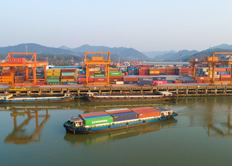 年关将至,安吉上港码头一派繁忙景象。大型龙门吊正在忙碌地作业,从驳船上装卸集装箱。作为上海港的喂给港,近年来,安吉上港通过“内外贸平衡”转型升级,稳外贸,提内贸,吞吐量稳中有升。安吉港至上海港的内河国际集装箱支线班轮,则为区域内的进出口企业降低了25%的物流成本。