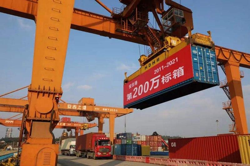 安吉港是省内重要的内河国际集装箱码头,也是长三角地区首个千吨级内河支线港口,自2011年以1.2万标箱开港以来,吞吐量保持稳定增长。安吉港连接以上海为核心的长三角、皖南及浙西北的物流枢纽效应进一步凸显。2021年12月1日,随着第200万标箱货柜进舱,标志着安吉港集装箱吞吐量突破200万标箱,安吉港也成为全省第一个突破200万标箱的内河港口。安吉上港国际港务有限公司总经理助理黄萱磊表示,目前安吉港已与多个“一带一路”沿线国家实现了贸易互通,与全球1000多个港口和地区实现了通达。