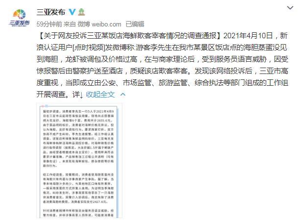 2021年4月10日,新浪认证用户[点时视频]发微博称:游客李先生在我市某景区饭店点的海胆蒸蛋没见到海胆,龙虾被调包及价格过高,在与商家理论后,受到服务员语言威胁,因受惊报警后由警察护送至酒店,质疑该店欺客宰客。发现该网络投诉后,三亚市高度重视,当即成立由公安、市场监管、旅游监管、综合执法等部门组成的工作组开展调查。