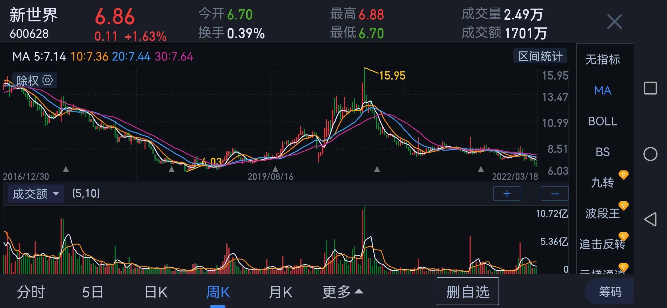 4、新世界:公司是上海国企,一直以来,有三个大佬在紧盯着新世界,刘益谦两次举牌,平均价格19.26元/股。昝圣达定向增发进来,11.43元/股的价格。还有沈国军,曾经与昝圣达联手要拿下新世界控股权。目前调整回到2019年1月低点附近,机构疯狂打压吸筹,再怎么打还能消灭新世界?散户已经被打的遍体鳞伤了,下一步可能就是爬坡上行。