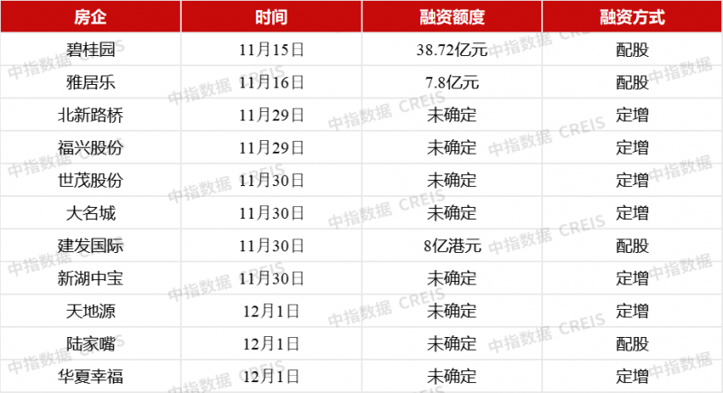 同样在11月28日,证监会决定在股权融资方面调整优化5项措施,恢复涉房上市公司并购重组及配套融资,恢复上市房企和涉房上市公司再融资等。截至目前,碧桂园配股融资38.72亿元居首位,雅居乐配股融资7.8亿元,这是“第三支箭”支持房企股权融资落到实处的体现。
