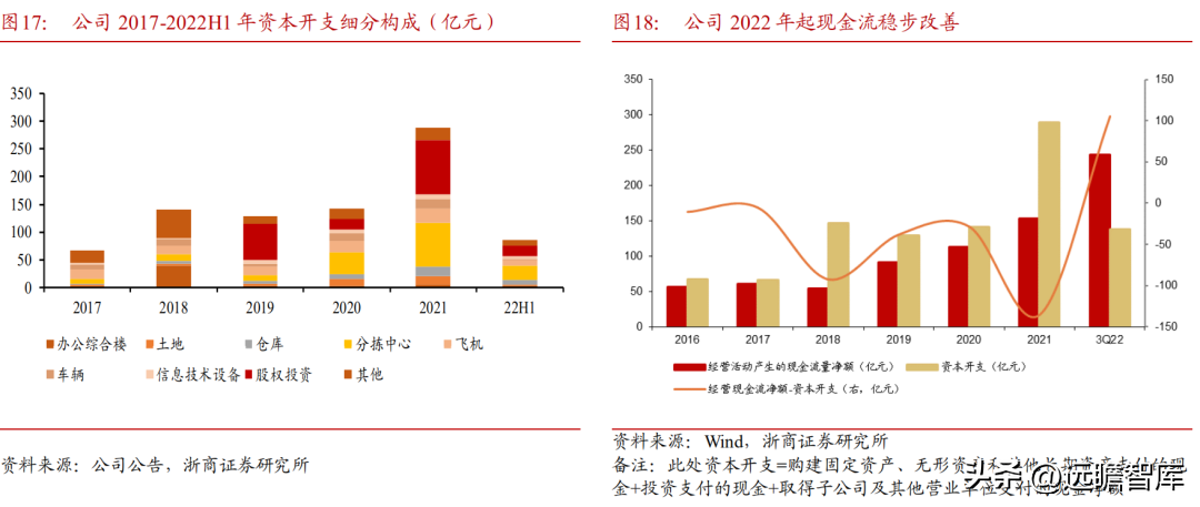 在资本运作上,公司2017年借壳鼎泰新材登陆A股,进入2021年节奏推进加速,9月并表H股嘉里物流,11月199亿元A股定增落地,12月旗下顺丰同城登陆联交所;2022年7月参股鄂州机场项目投运,并表转运中心截至22年中报已完成土建施工,预计23年具备运行条件。