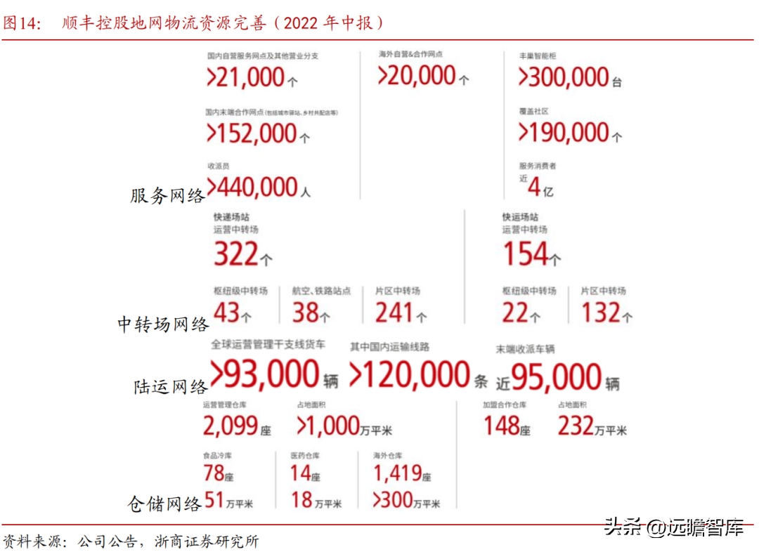 截至2022年上半年,服务网络端顺丰拥有超2.1万个国内自营网点和2万个海外网点,收派员约44万人;中转场网络端顺丰拥有43个枢纽级中转场,38个航空、铁路站点,241个片区中转场;陆运网络端顺丰拥有自营及外包干支线车辆约9.5万辆,末端收派车辆约9万辆;仓储网络端顺丰拥有2099个运营管理仓库,占地面积超1000万平方米,其中包括海外仓1419座,加盟合作仓148座,形成触达全球的仓储网络,可提供电商、食品医药冷运等多行业、全场景的仓配一体服务。