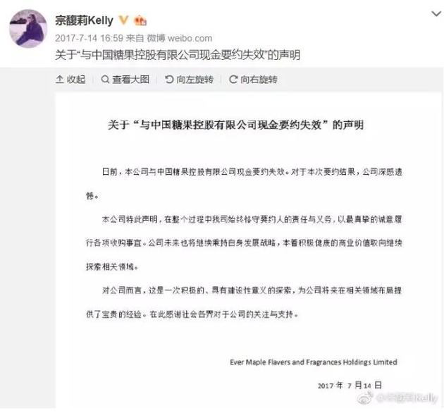 7月14日,宗馥莉在微博上表示:“对于本次要约结果,公司深感遗憾。公司未来也将继续秉持自身发展战略,本着积极健康的商业价值取向继续探索相关领域。”