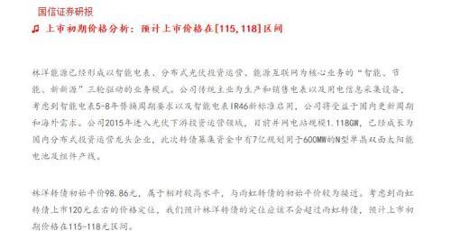 券商分析师预计:林洋转债上市后的价格大概在115元到118元之间,有望冲击120元。也就是说中签了预计可以15%到20%左右。