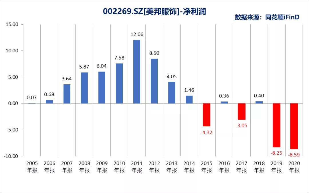 美邦服饰的净利润表现比营收更加难堪,2012年开始与营收同步下滑,2015年首次出现亏损,高达4.32亿元。