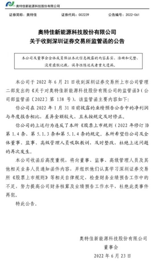 深交所表示,由于奥特佳在2022年1月31日前披露的业绩预告公告中的净利润与年度报告相比,差异金额较大,且未按规定及时修正。