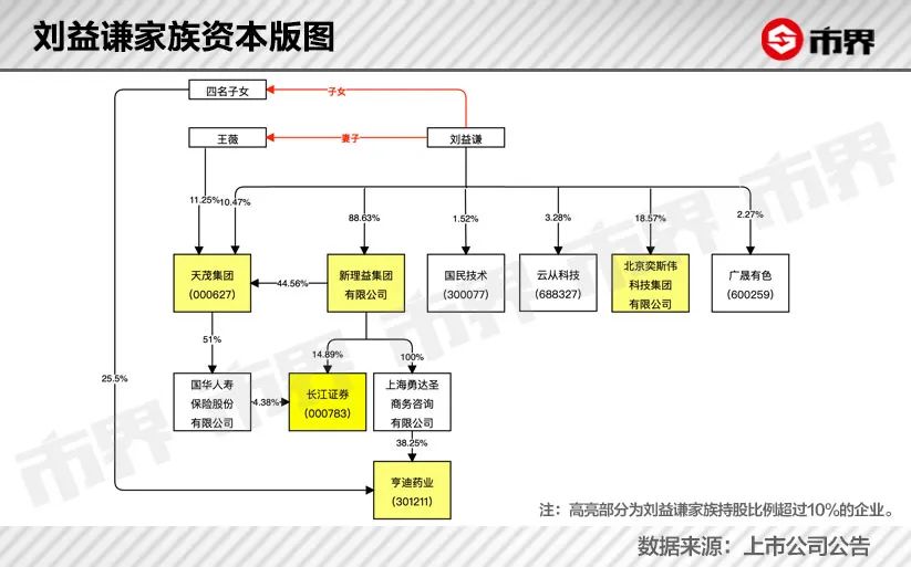 截至2022年第一季度末,新理益持股天茂集团44.56%、刘益谦妻子王薇持股11.25%、刘益谦持股10.47%,刘益谦家族合计持股天茂集团66.28%。
