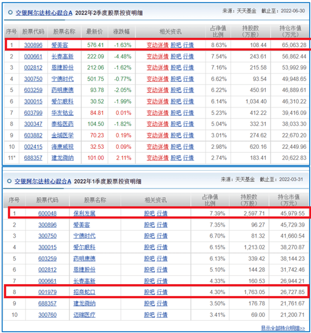 我们来看下交银阿尔法核心混合的前十大持仓股。截至2022年6月末,该基金前十大持仓股分别为医美龙头爱美客、医药股长春高新、药明康德、爱尔眼科、泰格医药、金域医学,新能源宁德时代、华友钴业、恩捷股份,安防巨头海康威视。