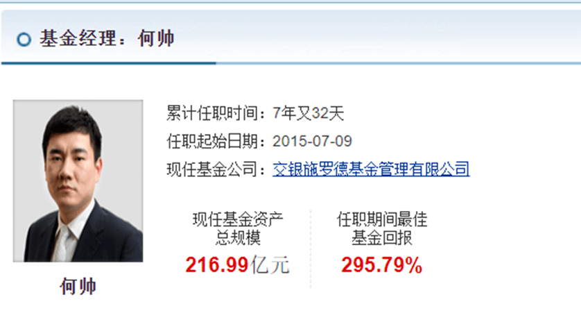 公开资料显示,何帅毕业于上海财经大学,2010年毕业后他先是加入国联安基金,从研究员做起,2012年跳槽至交银施罗德基金继续担任行业分析师。在研究员的硬板凳上坐满5年后,何帅在2015年7月正式开始操盘,成为一名基金经理。