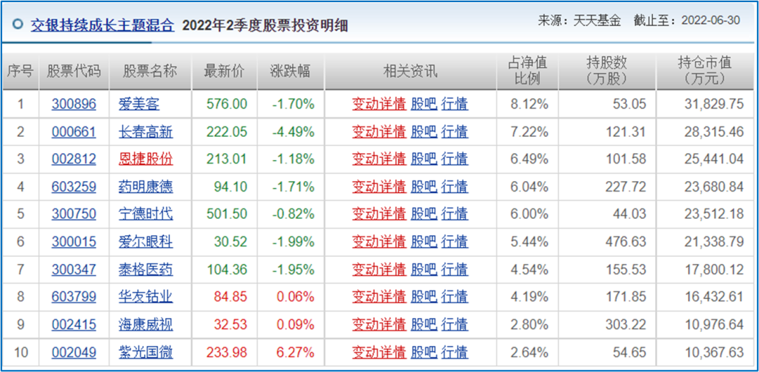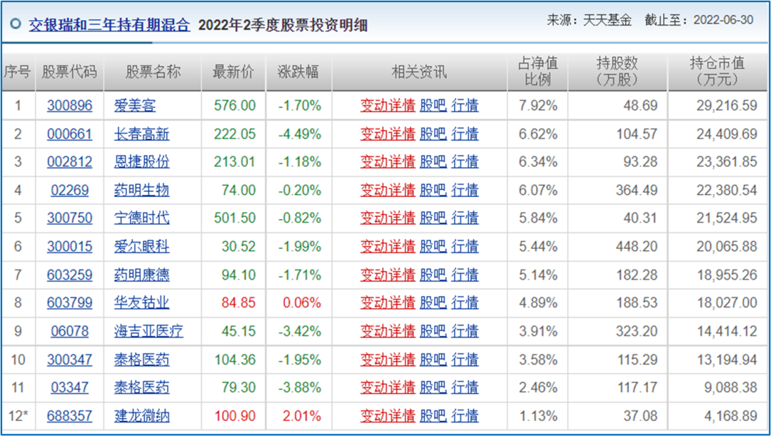 我们来看下交银阿尔法核心混合的前十大持仓股。截至2022年6月末,该基金前十大持仓股分别为医美龙头爱美客、医药股长春高新、药明康德、爱尔眼科、泰格医药、金域医学,新能源宁德时代、华友钴业、恩捷股份,安防巨头海康威视。