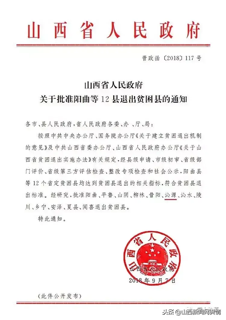 9月7日,省政府发布通知,批准2017年度计划摘帽退出的12个省定贫困县(区)退出贫困县,沁源县位列其中。成为全市首个、全省首批脱贫摘帽县。市委书记孙大军在市脱贫攻坚领导小组2018年第六次会议上强调,“沁源县正式脱贫摘帽退出贫困县,这是我市脱贫攻坚工作取得的重大胜利,沁源这场硬仗,打得好!”在脱贫攻坚工作中,沁源县围绕“两不愁、三保障”,坚持高站位思考、高标准部署、严要求督查、超常规落实,“战区制”推进,在精准识别、动态管理的基础上,推进产业扶贫、健康扶贫、教育扶贫、住房保障、金融扶贫等十大脱贫工程,打出了一套脱真贫、真脱贫的组合拳。12月16日,在全国精准扶贫精准脱贫成果交流会上,沁源县以“巩固提升脱贫成效 决战决胜全面小康”为题的脱贫攻坚典型案例入选《全国脱贫攻坚优秀案例》资料汇编;同时喜获“全国脱贫攻坚优秀城市”荣誉称号。