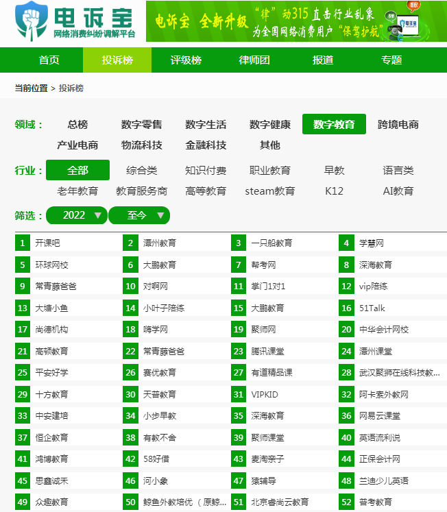 据国内知名网络消费纠纷调解平台“电诉宝”(315.100EC.CN)显示,2022年至今,“电诉宝”受理投诉中涉及的在线教育平台按投诉量依次为开课吧、潭州教育、一只船教育、学慧网、大鹏教育、帮考网、深海教育、常青藤爸爸、对啊网、掌门1对1、VIP陪练、大塘小鱼、小叶子陪练、大鹏教育、51Talk、尚德机构、嗨学网、聚师网、高顿教育、腾讯教育、平安好学、赛优教育、有道精品课、十方教育、天普教育、VIPKID、阿卡索外教网、中安建培、小步早教、深海教育、网易云课堂、恒企教育、有教不舍、英语流利说、鸿博教育、麦淘亲子、思鑫诚禾、河小象、兰迪少儿英语、众趣教育、鲸鱼外教培优、北京睿尚云教育、普考教育等。