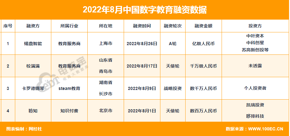 据网经社旗下大数据库“电数宝”(DATA.100EC.CN)监测数据显示,2022年8月数字教育领域共发生4起融资,融资方分别为锡鼎智能、校满满、卡罗德钢琴、聆知,融资总额超1.3亿元人民币。