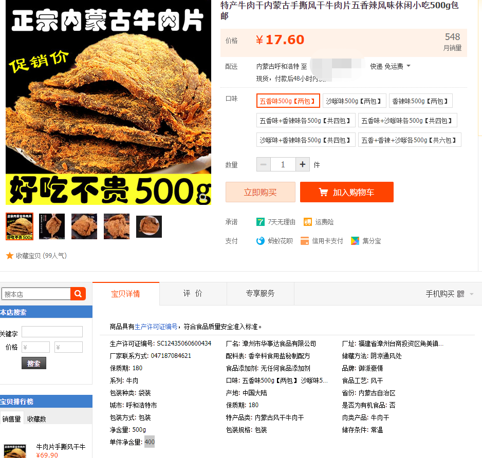 从种种迹象表明,这家网店销售的牛肉干的来路不明确,网店标注信息有非常明显的错误,且与实际商品信息也相距甚大。