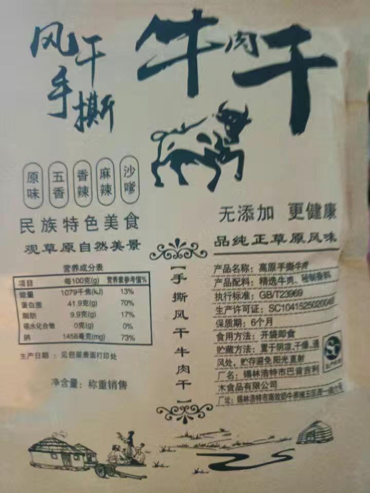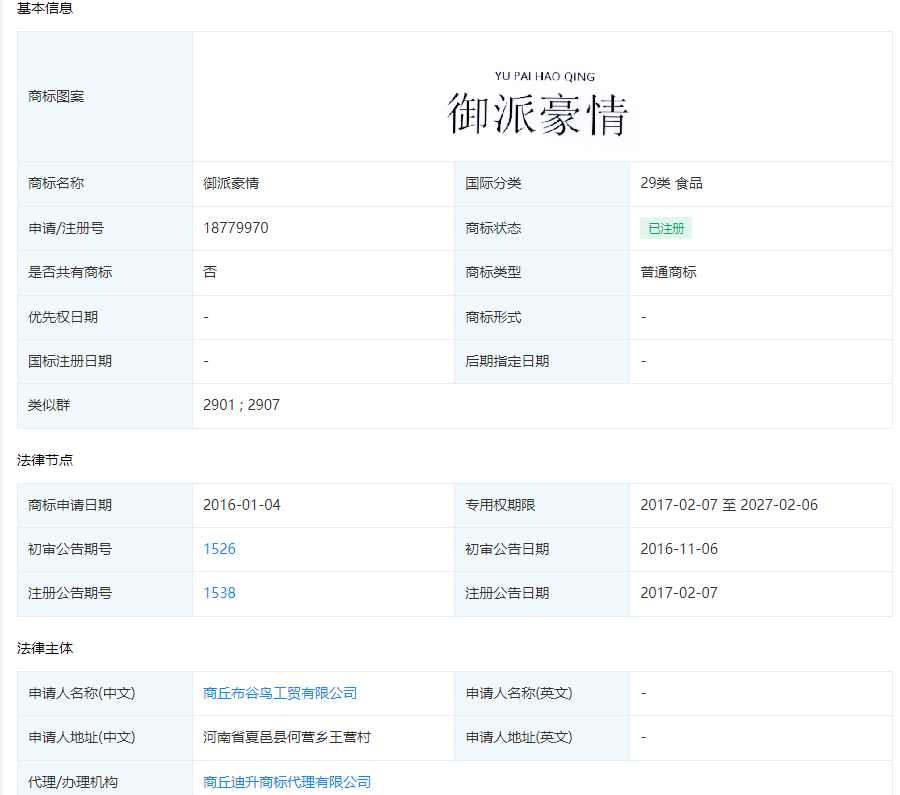 品牌:御派豪情,我在企查查上查得的信息是,该商标(牛肉干)是属于一家名为商丘布谷鸟工贸有限公司的。