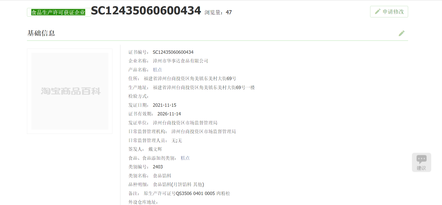 我们来细细的研究下,它的宝贝详情资料,生产许可证编号:SC12435060600434,通过购物平台的查询平台我还真的查到了他的生产许可证的详细资料,他的生产许可的范围是食品馅料,牛肉干可不是食品馅料啊。