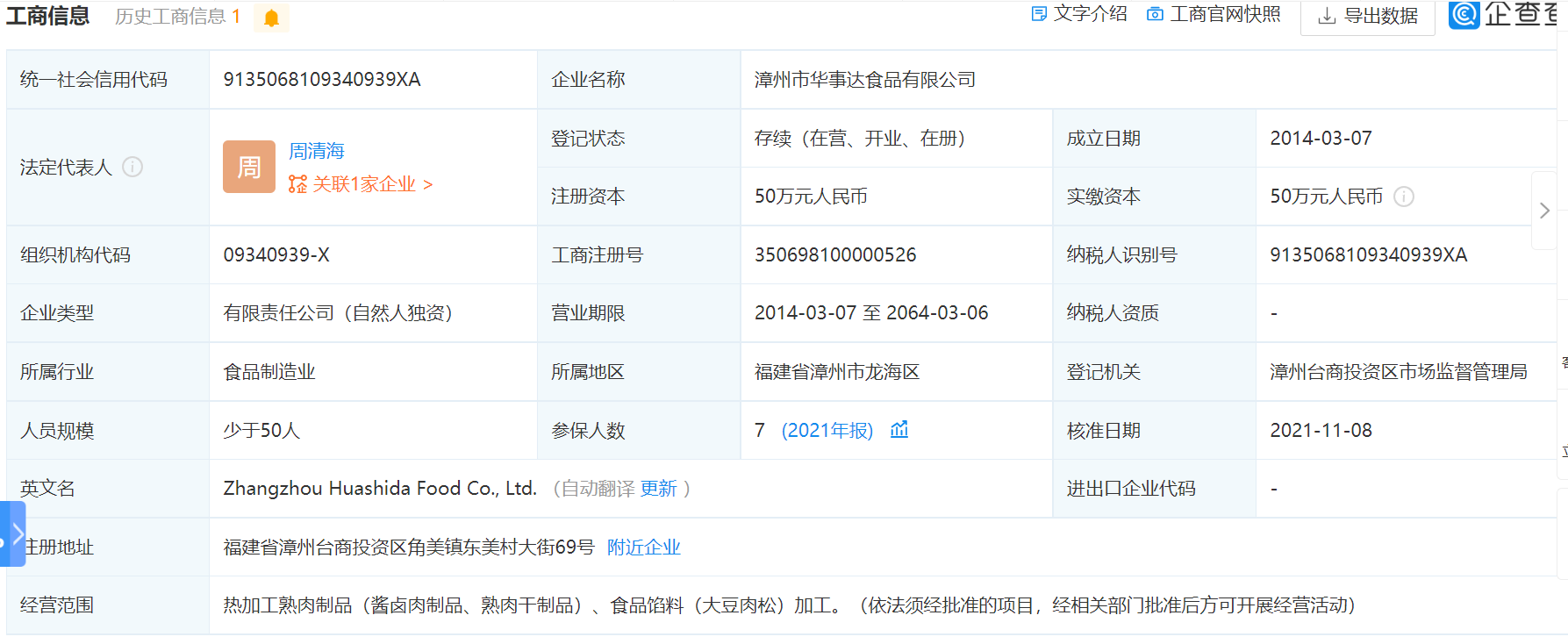 我特此到企查查上查了下漳州市华事达食品有限公司,该公司是有经营熟肉干制品范围的。